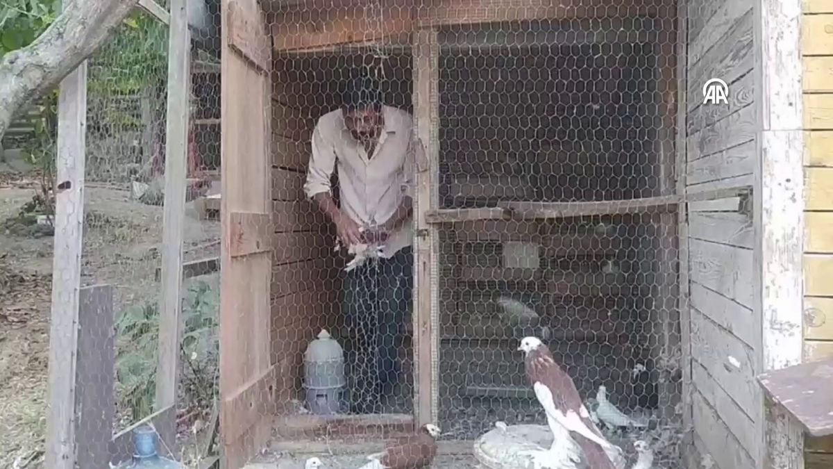 Bursa'nın Mudanya ilçesinde çocukluğundan bu yana kuş besleyen Oktay Samast, arazisine kurduğu kümeslerde yaklaşık 500 güvercine bakıyor.
