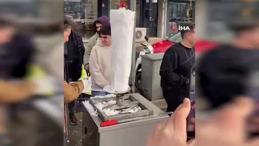 Bursa'nın İnegöl ilçesinde bir döner ustası, kar yağışını fırsata çevirerek dikkat çeken bir etkinliğe imza attı. Döner şişine kar kütlesi takan usta, iş yerinin önünde vatandaşlara "kardan döner" ikram etti.