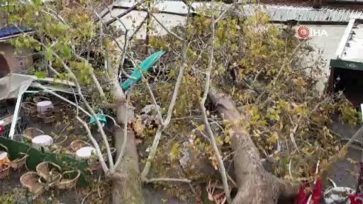 Bursa'da saatteki hızı 100 kilometreye ulaşan şiddetli fırtına tarihi Kozahan'daki 250 yıllık çınar ağacını kökünden söktü. Olayın gece yaşanması muhtemel faciayı önlerken, kafeteryalar da çınarın kırılan devasa dallarıyla zarar gördü. Devrilen çınarın görüntüsü dron ile görüntülendi.