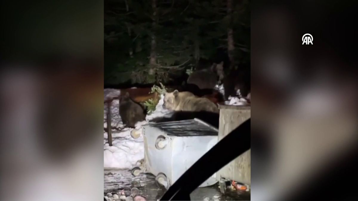 Bursa'da, Uludağ'ın Sarıalan bölgesinde yiyecek aramak için çöp konteynerlerini karıştıran ayılar görüntülendi.