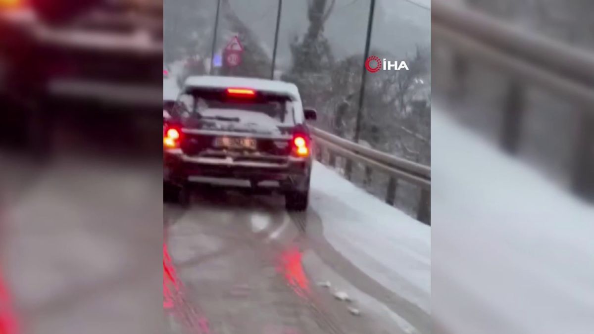 Bursa’da Uludağ’dan cipiyle inmek isteyen sürücü, kar ve buzda zor anlar yaşadı. Mahsur kalan aracı onlarca kişi iterek kurtarırken, araç bu kez de buzlu yolda kaymaya başladı. Vatandaşların durdurmak için uğraştığı cip metrelerce ilerledikten sonra dururken, panik dolu anlar kameraya yansıdı.
