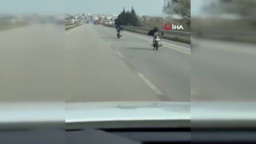Bursa’da karayolunda kaydedilen görüntüler trafikteki tehlikeyi bir kez daha gözler önüne serdi. İki motosiklet sürücüsünün yüksek hızda motosiklet üzerine uzanarak yaptığı tehlikeli yolculuk cep telefonu kamerasına yansıdı.