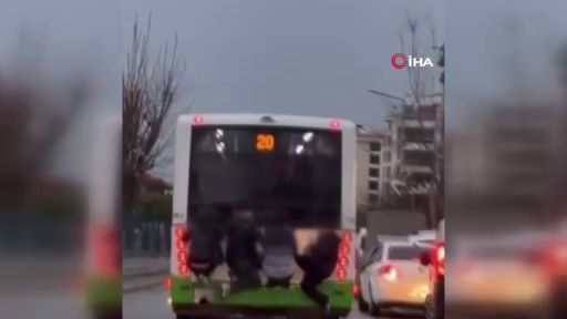 Bursa'nın Yıldırım ilçesine bağlı Millet Mahallesi Cengizhan Caddesi üzerinde seyir halindeki belediye otobüsünün arkasına tutunarak ilerleyen 4 çocuk, çevrede paniğe neden oldu.