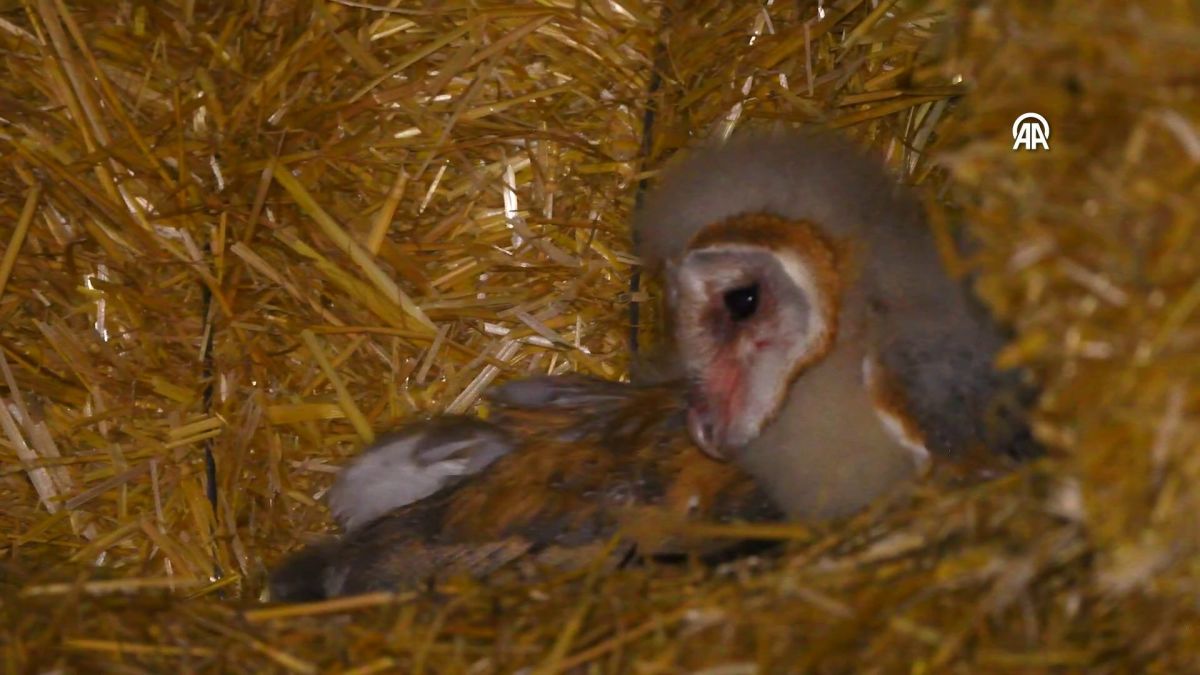 Bursa'da çiftliğin samanlığına yuva yapan peçeli baykuş ailesi görüntülendi