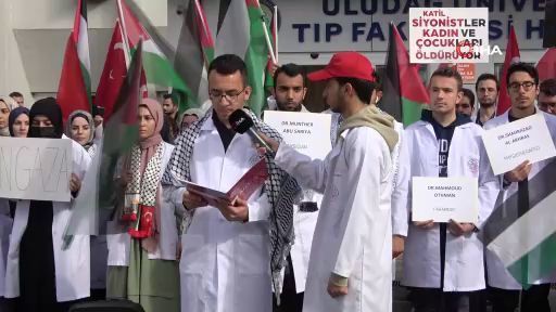 İsrail'in Gazze'ye yönelik saldırıları ve hastanelerin bombalanarak masum insanların şehit edilmesi Uludağ Üniversitesi Tıp Fakültesi öğrencileri, Uluslararası Doktorlar Derneği (AID) ve Sağlıkta İyilik Hareket Topluluğu öncülüğünde Uludağ Üniversitesi önündeki basın açıklamasıyla telin edildi