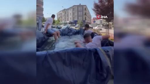 Bursa'da sıcak havalardan bunalan bir grup genç, traktörün römorkunu suyla doldurup mobil havuza çevirdi. Şehir turu atan gençler sıcak havaların tadını doyasıya çıkardılar.