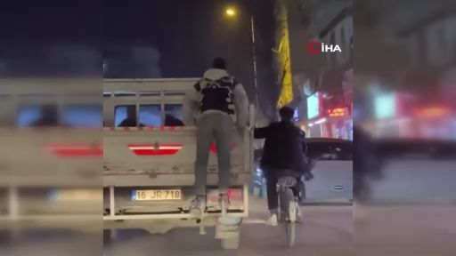 Bursa'nın İnegöl ilçesinde iki gencin trafikte yaptığı tehlikeli yolculuk amatör kameraya yansıdı.