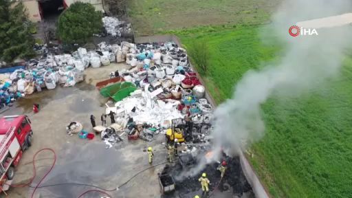 Bursa'da geri dönüşüm tesisinde çıkan yangın havadan görüntülendi