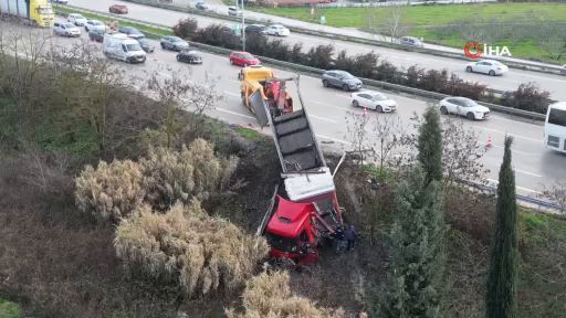 Bursa’da kontrolden çıkan tır refüje uçtu. Facianın teğet geçtiği kazada sürücü yaralanırken, otobanda trafik uzun kuyruklar oluşturdu.