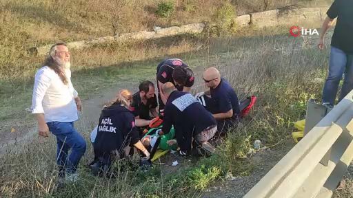 Motosiklet üzerinde bulunan sürücü Hakan Y. ile arkasında yolcu olarak bulunan Hülya B. (35) bariyerlerin üzerinden yol kenarına savruldu. Motosiklet ise yolda bir süre başıboş gittikten sonra yol kenarına devrildi.