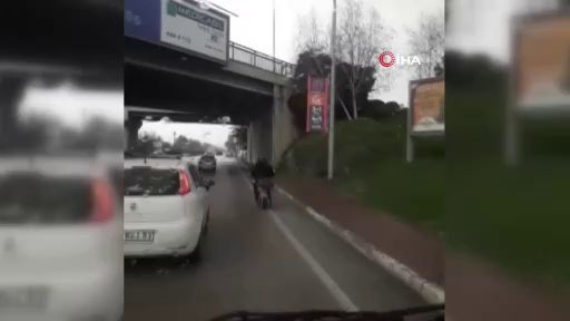 Bursa'da hava yağmurlu olmasına rağmen kendi canını hiçe sayarak motosikletle merdiven taşıyan sürücü kameraya yansıdı.