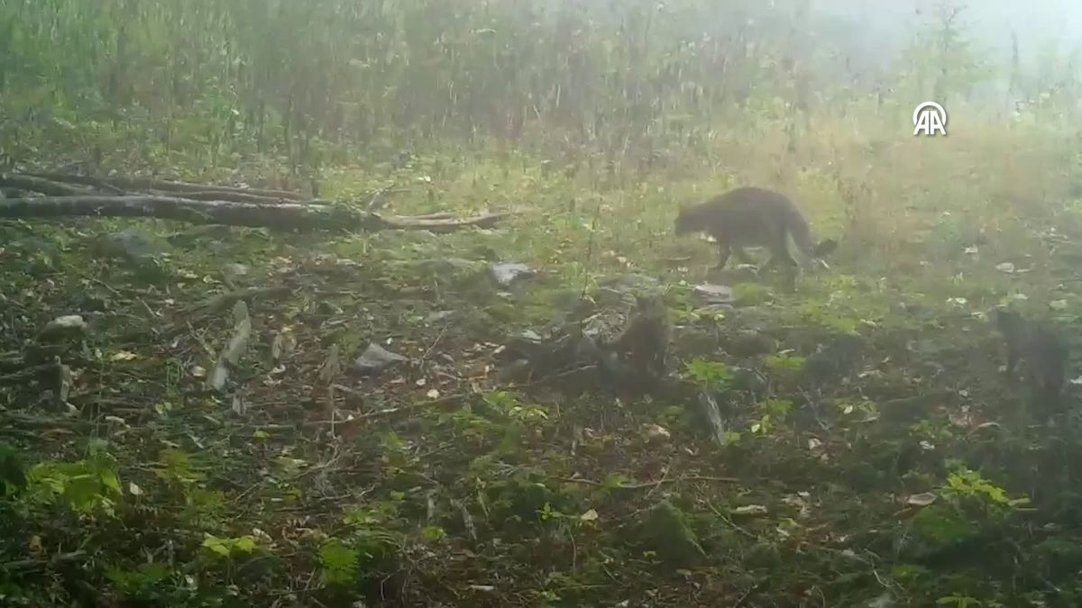 Bursa'da sisli havada ormanda yürüyen anne yaban kedisi ve iki yavrusu, fotokapanla kayda alındı.