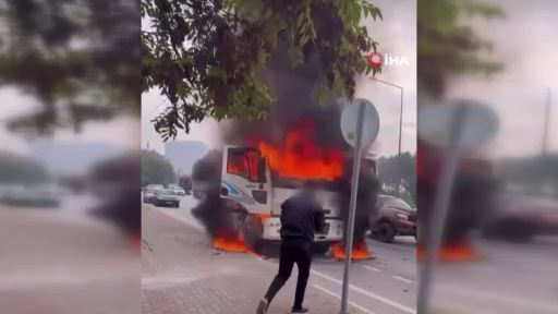 Bursa Çevre Otoyolu’nda seyir halindeki bir kamyon, henüz belirlenemeyen bir nedenle yanmaya başladı. Alevler kısa sürede tüm aracı sararken, o anlar çevredeki sürücüler tarafından cep telefonu kamerasıyla kaydedildi.