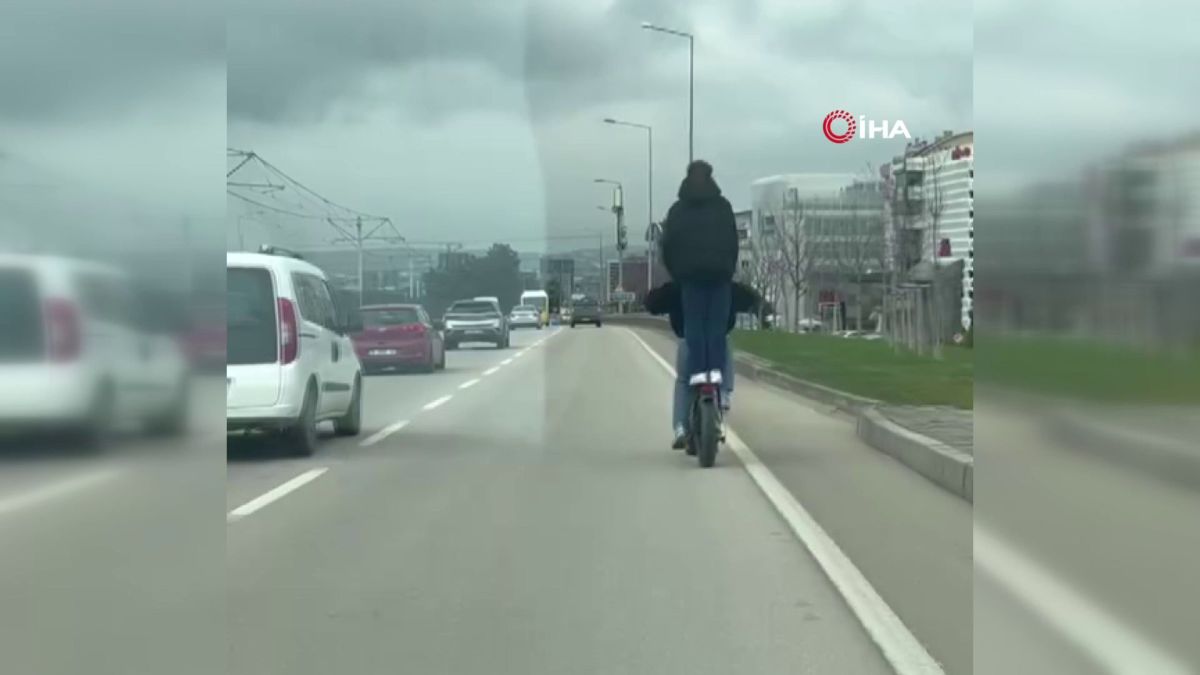 Bursa'da bisikletin arkasında yolcu konumunda seyreden genç, bir anda kendisini kuş zannetti. İlginç anlar amatör kameraya yansıdı.