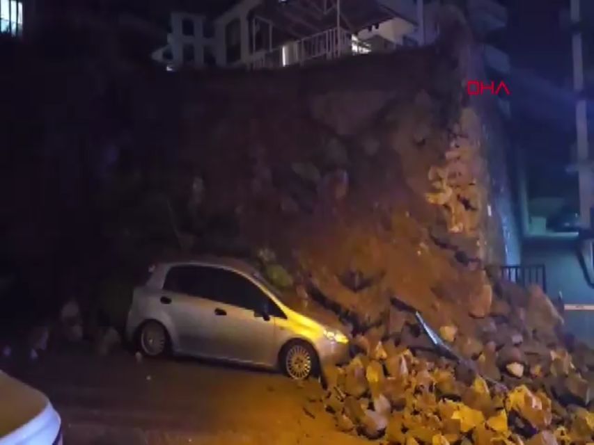 Bursa'nın Mudanya ilçesinde bir sitenin istinat duvarının çökmesi sonucu park halindeki otomobil kullanılamaz hale geldi.