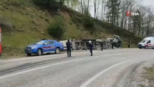 Bursa'nın İnegöl ilçesinde su yüklü tır devrildi, sürücüsü yaralandı.