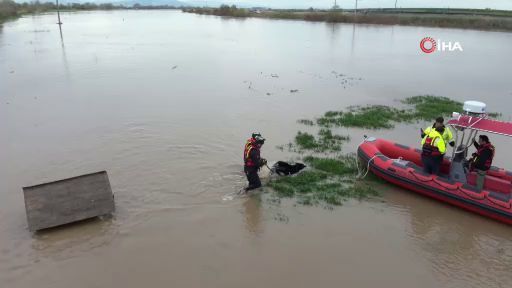 Bursa’nın Karacabey ilçesinde meydana gelen su taşkınında bağ evinde mahsur kalan 2 köpek, Bursa Büyükşehir Belediyesi ekiplerinin başarılı operasyonu ile kurtarıldı.