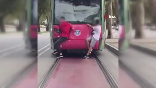 Bursa’da iki çocuk seyir halindeki tramvayın arkasına takılarak yolculuk yaptı. O anlar kameraya yansıdı.