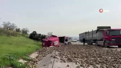 Bursa'da şeker pancarı yüklü tır kontrolden çıkıp, önce hafif ticari araca ardından kamyonete çarptı. Savrulan araçlar refüje girerken, tır devrildi. 1'i ağır 5 kişinin yaralandığı olay yerine çok sayıda sağlık ve polis ekibi sevk edildi.