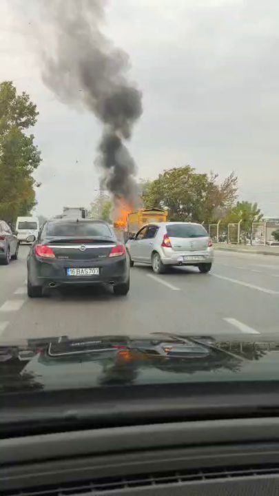 Bursa Çevre Otoyolu’nda seyir halindeki bir kamyon, henüz bilinmeyen bir nedenle yanmaya başladı. Alevler kısa sürede aracı sardı, o anlar saniye saniye kaydedildi.