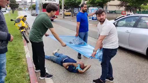 Bursa'nın İnegöl ilçesinde meydana gelen kazada devrilen motosikletten düşen görevli yaralandı. Yağış nedeniyle yaralanarak yere düşen görevliyi, vatandaşlar yağıştan çöp poşeti ile korudu.