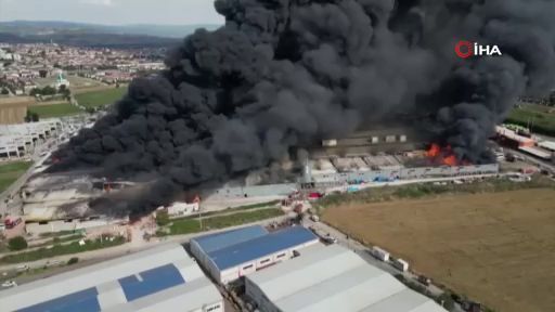 Bursa'nın İnegöl ilçesinde 4 fabrikanın alev topuna döndüğü yangın havadan dron ile görüntülendi.