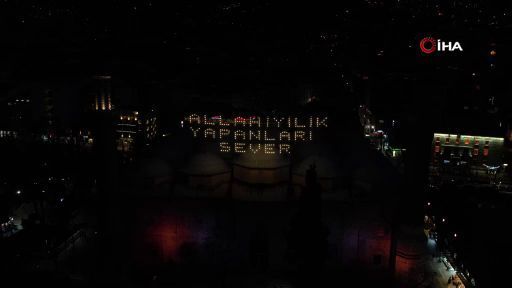 Bursa'daki tarihi Ulu Cami'nin minareleri arasına "Allah iyilik yapanları sever" yazılı mahya asıldı.