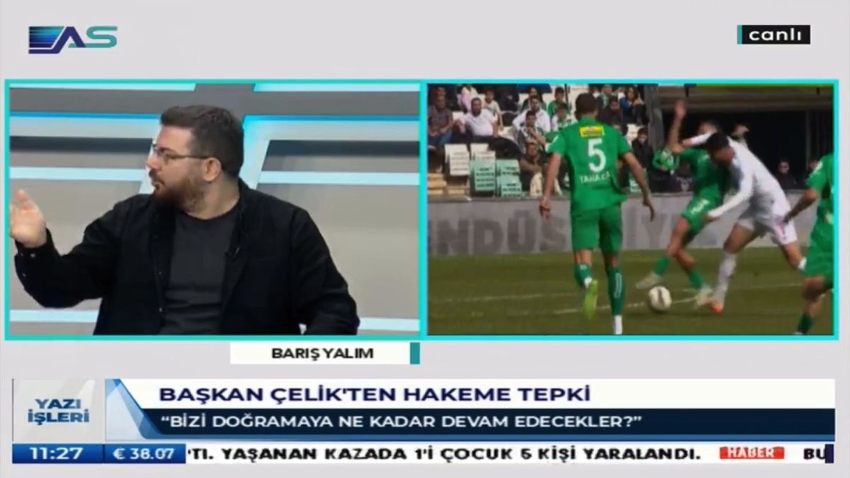 AS TV'de ‘Yazı İşleri’ programına katılan Barış Yalım, Bursaspor-Silifke Belediyespor maçında yaşanan ve Başkan Enes Çelik’in “Artık yeter” dediği pozisyonu yorumladı. Yalım, “Bu pozisyona faul vermemek futbola ve hakemliğe ihanettir.” dedi.
