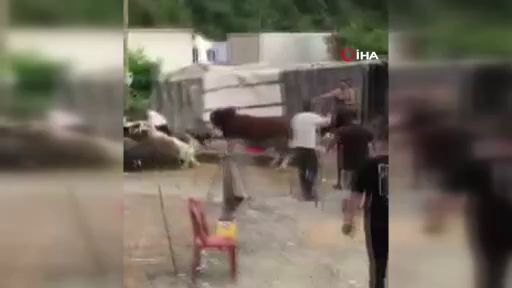 Artvin’in Hopa ilçesinde kurban pazarında ipini koparan boğa pazarı birbirine kattı. Kısa süreli paniğe neden olan boğa sahibi tarafından yakalanarak yeniden bağlanırken, o anlar çep telefonu kameralarına yansıdı.