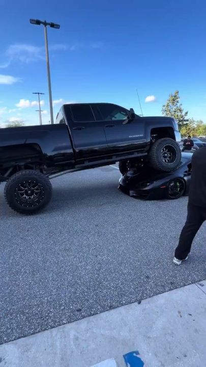 Dev pikap, park halindeki Lamborghini’nin üzerine çıkarak lüks aracı saniyeler içinde hurdaya çevirdi. Kazaya devasa arabada modifiye edilmiş süspansiyonun neden olduğu iddia edildi. Olayda kimse yaralanmadı.