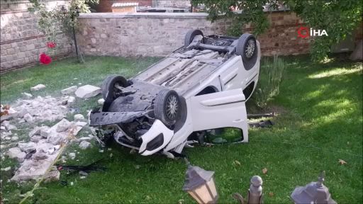 Edirne'de polisin 'dur' ihtarına uymayıp kaçan göçmen kaçakçısı şüphelinin kullandığı panelvan aracın cami bahçesine uçma anı kameraya yansıdı.