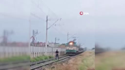 Adana'da rayların üzerine çıkan bir kişi, yük treninin geçişi sırasında soğukkanlı şekilde bekledi. Makinist, treni güçlükle durdururken ismi öğrenilemeyen kişi ise el sallayıp bölgeden uzaklaştı.