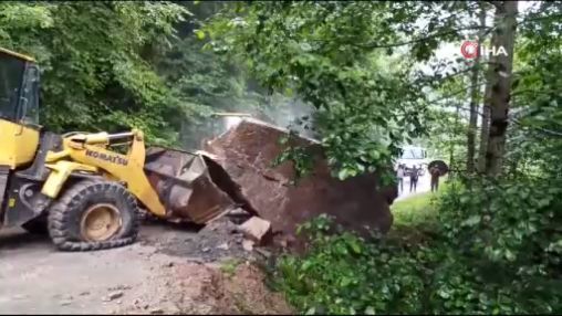 Rize'nin Çayeli ilçesine bağlı Gürpınar köyünde meydana gelen heyelanda yamaçtan kopan dev kaya yola düştü. Rize İl Özel İdaresi ekipleri, iş makinası ile kayayı kaldırarak kapanan yolu ulaşıma açtı.