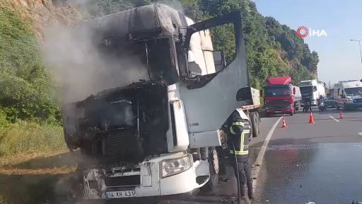 Zonguldak'ın Ereğli ilçesinde seyir halindeki tır alev aldı. Aracı yol kenarına park ederek inen sürücü canını zor kurtardı. Yangın, ekiplerin müdahalesi ile söndürüldü.