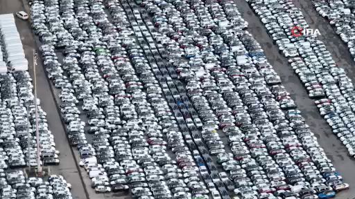 Görüntülerde araçlardan bazılarının gemilerden indirilerek, park alanlarına dizilmeye devam edildiği görülüyor.