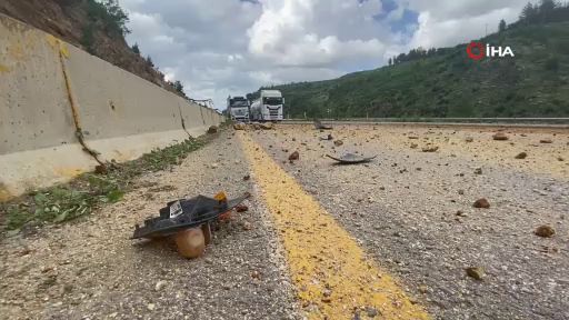 Yolda kayaya çarpan tır pert oldu, sürücünün burnu bile kanamadı